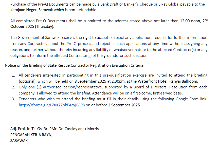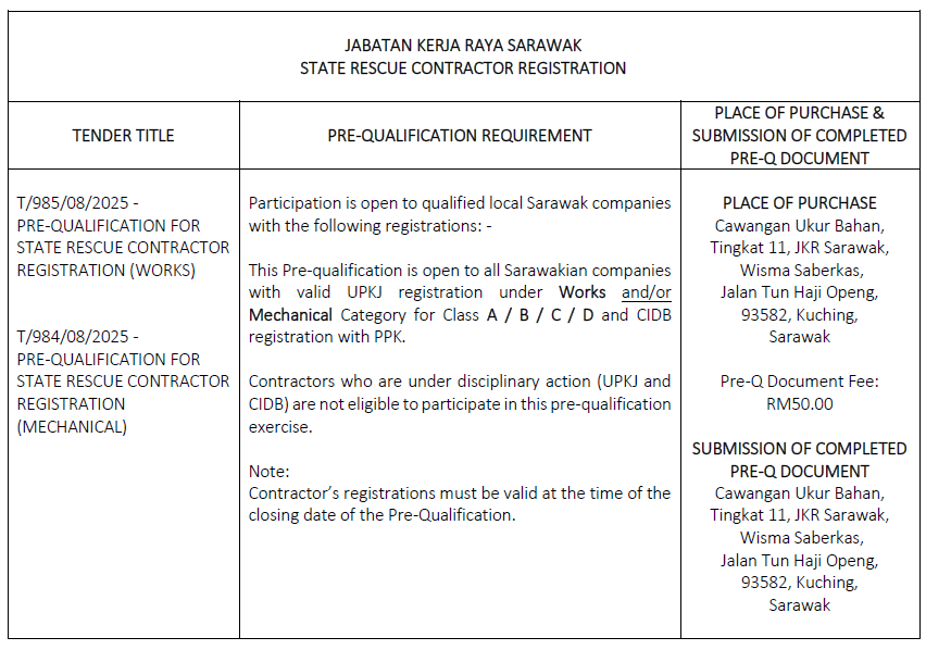 The following tender is to be submitted to the Chairman, State Divisional Tenders Board Samarahan, c/o Resident Office Samarahan, Tingkat 1, Kompleks Pentadbiran, Jalan Datuk Mohd Musa, 94300 Kota Samarahan, Sarawak not later than 12:00 noon on the Closing date as specified below. Tender documents may be obtained from JBALB Contract Section, Bahagian Samarahan, Lorong Bandar Baru Kota Samarahan, Jalan Datuk Mohd Musa, 94300 Kota Samarahan, Sarawak on payment of the specified document fee and document deposit.1. Tender No. T/JBALB/150/OCT.2025